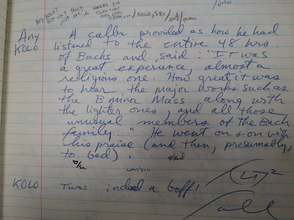 A caller provided as how he had listened to the entire 48 hrs. of Bachs and s__aid: “It was a great experience, almost a religious one. How great it was to hear the major works such as the B minor Mass along with lighter ones, and all those unusual members of the Bach Family.” He went on and on with his praise (and then, presumably, to bed).