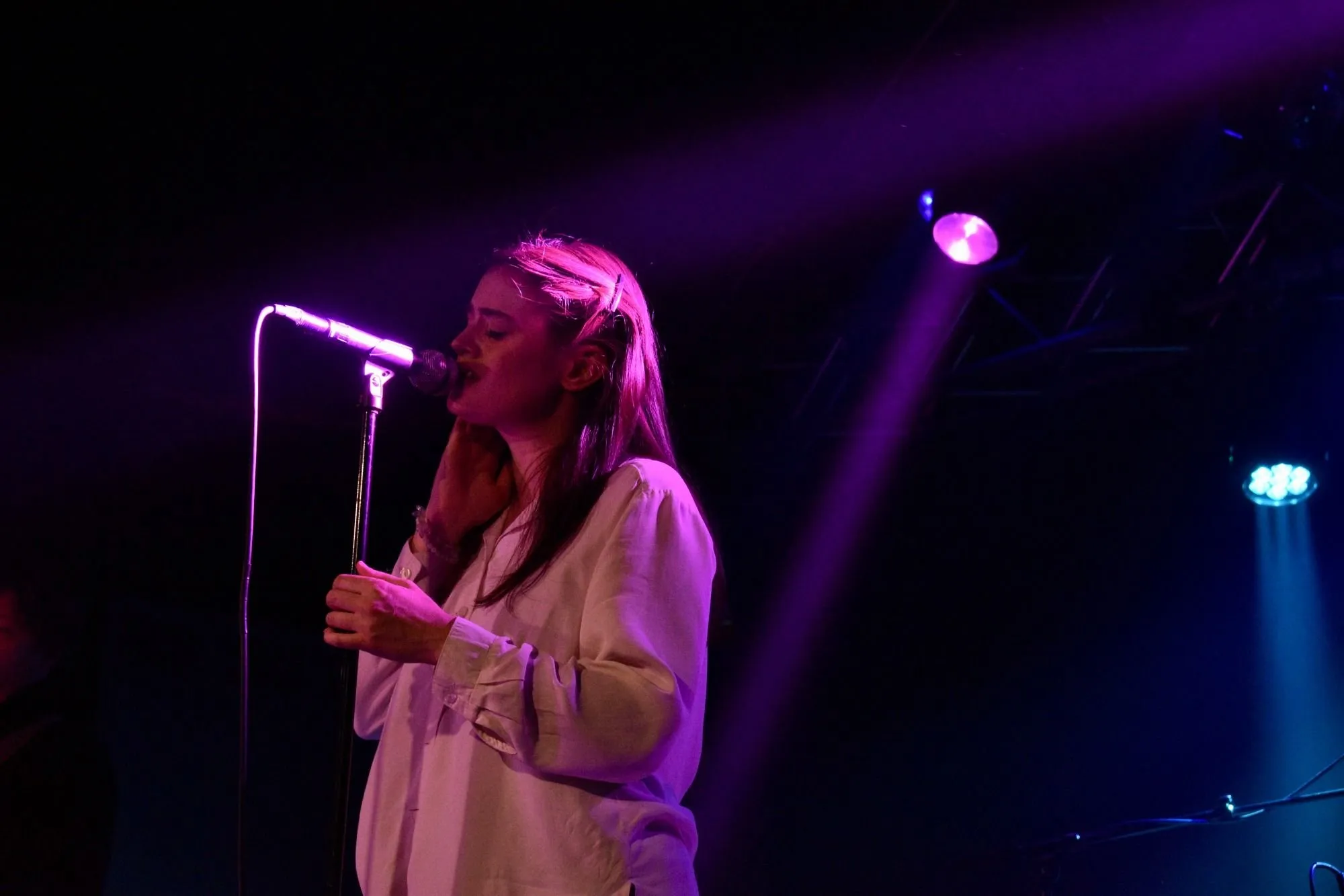 TOPS lead singer Jane Penny danced, or possibly floated, across the stage with the butterfly arms of a graceful ice skater. Lifting her flute to her lips, Penny harmonized with guitarist David Carriere on several songs and joked around with the audience. “I’m on my Shania Twain bullsh*t today,” she yelled as she pointed at her flowing white top. “Yeehaw!”