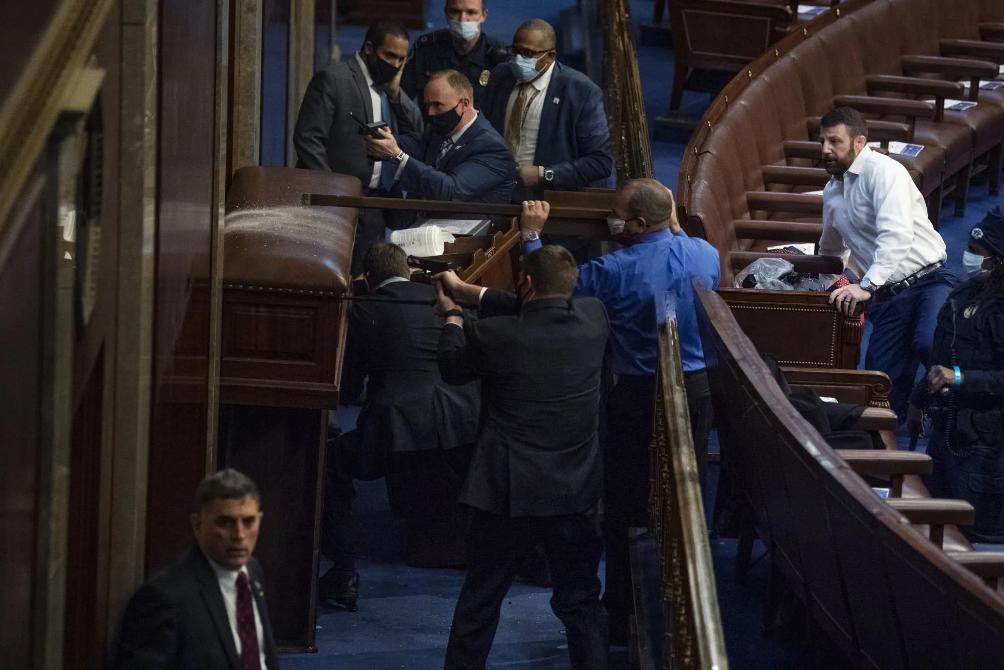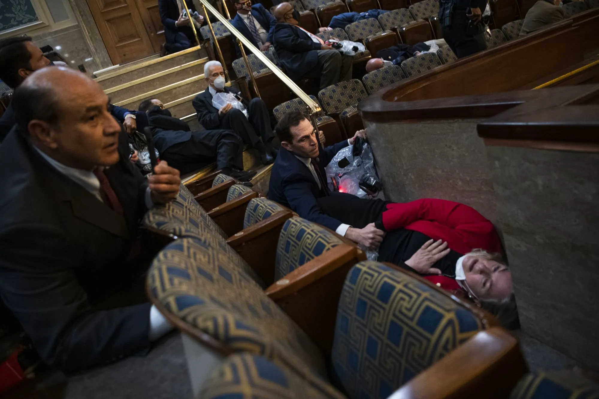 UNITED STATES - JANUARY 6: Rep. Jason Crow, D-Colo., comforts Rep. Susan Wild, D-Pa., while taking cover as rioters disrupt the joint session of Congress to certify the Electoral College vote on Wednesday, January 6, 2021. (Photo by Tom Williams for CQ Roll Call, Image used with express written permission of Mr. Williams)
