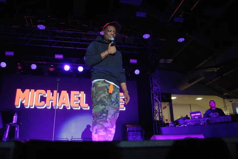 Michael Che performs stand-up alongside Cipha Sounds at the Boston Calling Arena, May 26, 2019. Photo: Trevor Bishai /WHRB