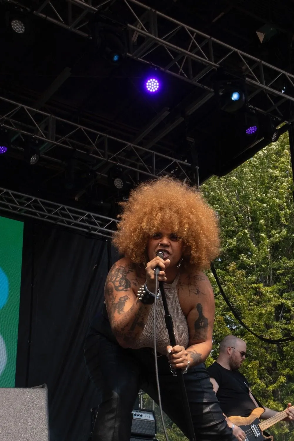 4-piece New Orleans punk band Special Interest blasted energy throughout the Red Stage despite the sweltering heat. The scene was set with sounds of crashing thunder, an appropriate backdrop for lead singer Alli Logout’s entrance. The band started with their song Disco III, with Logout screaming the chorus “sodomy, LSD, sodomy on LSD.” They strutted and danced across the stage with a wild expression on their face, at one point getting down on all fours and staring intensely into the crowd. They belted the lyric “release me,” but the enraptured audience had no means or desire of being released from their grasp. A small but enthusiastic mosh pit started up, and when Logout screamed “get inside me girl,” they had the crowd swooning.