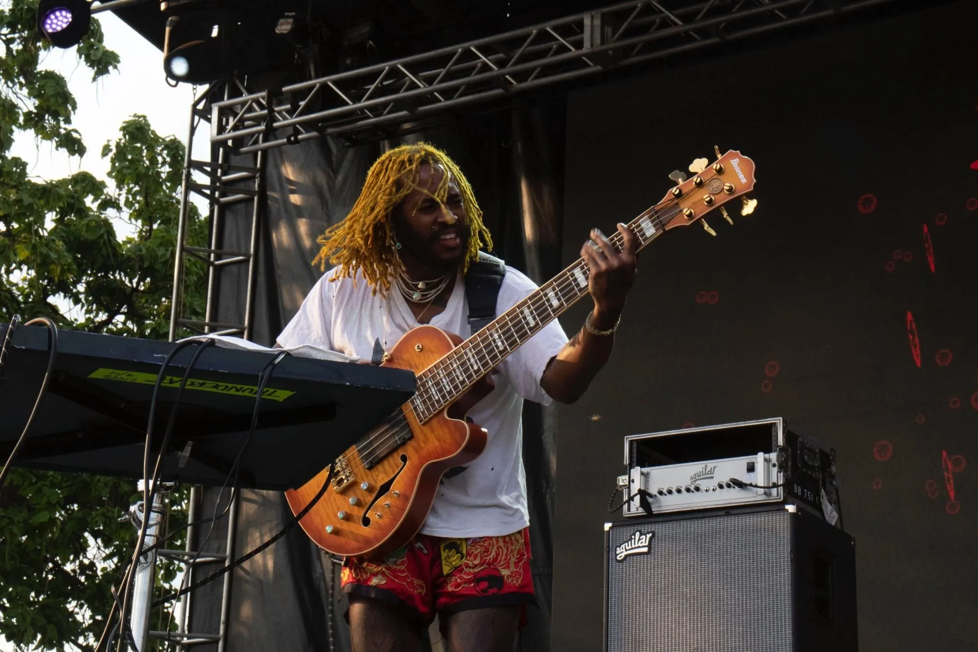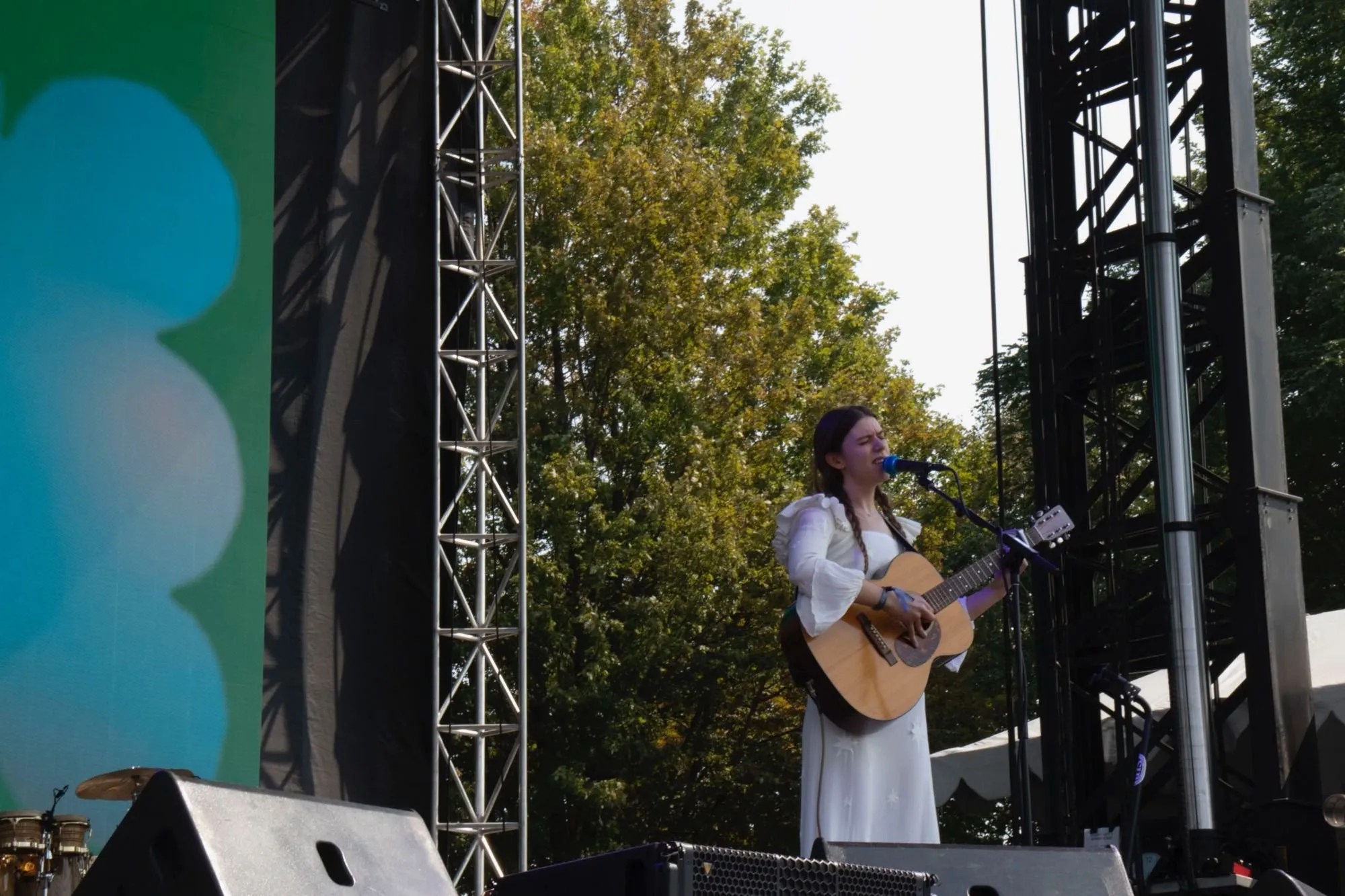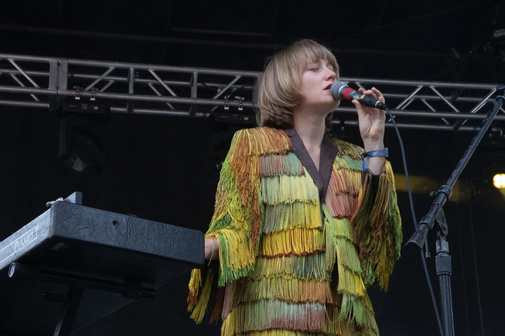The Weather Station’s collective outfits could be called Variations on Yellow, with singer-songwriter Tamara Lindeman stealing the stage in a yellow-green two-piece fringe fit. Sometimes drowned out by Caroline Polachek on the Green Stage, Lindeman told her crew: “feel free to turn us up. I always hate to compete, but…” And compete The Weather Station did, featuring a triangle and tambourine for the tune “Thirty,” and a cerebral, jazzy saxophone solo by Karen Ng on “Robber.”