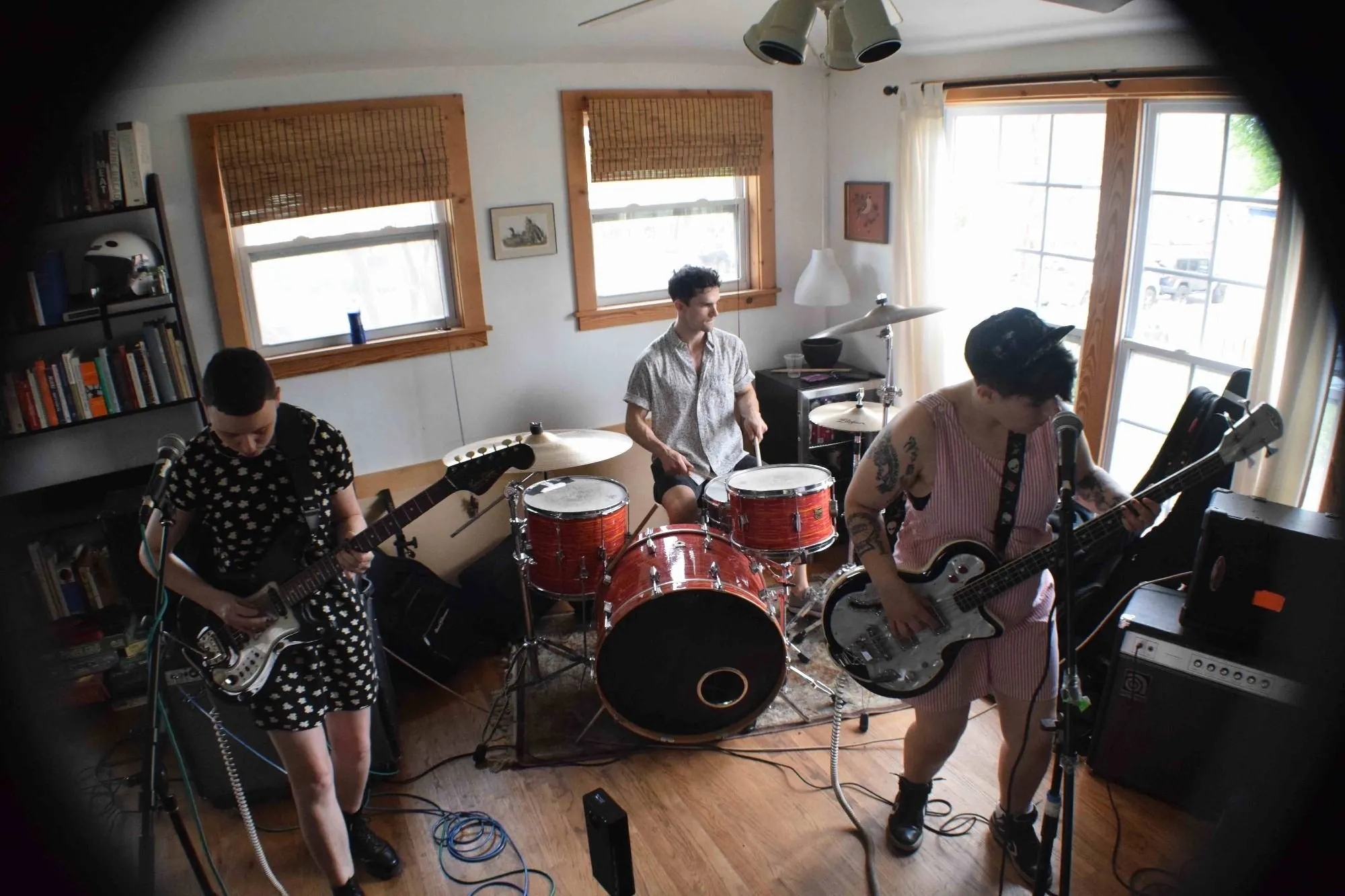 A three piece from Brooklyn, A Deer A Horse delivers a strong blend of sludgy baselines and interesting melodies. Their sound is spooky, but not scary, gothic influenced but not explicitly dark; a meaty guitar-bass-drum overlaid with Rebecca’s propulsive, momentous vocals. We saw them at an afternoon house show in northwest Austin, quite the bold pairing with your medium strength noontime black coffee.